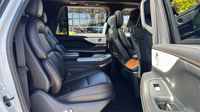 This Lincoln Navigator L is equipped with Equipment Group 800A Black Label, 28 Speakers, 3rd row seats: split-bench, 4-Wheel Disc Brakes, A/V remote, ABS brakes, Adaptive suspension, Adjustable pedals, Air Conditioning, All-Weather Flr Liners w/Fr & Rr Carpet Floor Mats, Alloy wheels, AM/FM radio: SiriusXM with 360L, Apple CarPlay/Android Auto, Audio memory, Auto High-beam Headlights, Auto Htd & Ventilated Opulence Lthr Capt Chair, Auto Start-Stop Technology, Auto tilt-away steering wheel, Auto-dimming door mirrors, Auto-dimming Rear-View mirror, Auto-leveling suspension, Automatic temperature control, Brake assist, Bumpers: body-color, Cargo Area Management System, Compass, Delay-off headlights, Driver door bin, Driver vanity mirror, Driver's Seat Mounted Armrest, Dual front impact airbags, Dual front side impact airbags, Electronic Stability Control, Emergency communication system: 911 Assist, Enlighten Theme, Exterior Parking Camera Rear, Four wheel independent suspension, Front anti-roll bar, Front Bucket Seats, Front dual zone A/C, Front reading lights, Fully automatic headlights, Garage door transmitter, Head restraints memory, Headphones, Heated door mirrors, Heated front seats, Heated rear seats, Heated steering wheel, HVAC memory, Illuminated entry, Leather steering wheel, Lincoln Connect, Lincoln Premium Connectivity, Low tire pressure warning, Memory seat, Navigation system: Connected Navigation (1-year trial), Occupant sensing airbag, Outside temperature display, Overhead airbag, Overhead console, Panic alarm, Passenger door bin, Passenger seat mounted armrest, Passenger vanity mirror, Pedal memory, Power adjustable front head restraints, Power adjustable rear head restraints, Power door mirrors, Power driver seat, Power moonroof, Power passenger seat, Power steering, Power windows, Radio data system, Radio: Revel Ultima 3D AM/FM/HD Audio System, Rain sensing wipers, Rear air conditioning, Rear anti-roll bar, Rear audio controls, Rear reading lights, Rear seat center armrest, Rear window defroster, Rear window wiper, Reclining 3rd row seat, Remote keyless entry, Security system, SiriusXM w/360L, Speed control, Speed-sensing steering, Speed-Sensitive Wipers, Split folding rear seat, Spoiler, Steering wheel memory, Steering wheel mounted audio controls, Tachometer, Telescoping steering wheel, Tilt steering wheel, Traction control, Trip computer, Turn signal indicator mirrors, Variably intermittent wipers, Ventilated front seats, Ventilated rear seats, and Wheels: 22" High-Gloss Ebony Aluminum.