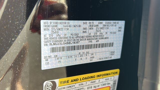 This Lincoln Navigator L is equipped with Equipment Group 202A Reserve II, 28 Speakers, 3rd row seats: split-bench, 4-Wheel Disc Brakes, ABS brakes, Adaptive suspension, Adjustable pedals, Air Conditioning, Alloy wheels, AM/FM radio: SiriusXM with 360L, Apple CarPlay/Android Auto, Audio memory, Auto High-beam Headlights, Auto Htd & Ventilated Premium Lthr Captain's Chair, Auto Start-Stop Technology, Auto tilt-away steering wheel, Auto-dimming door mirrors, Auto-dimming Rear-View mirror, Auto-leveling suspension, Automatic temperature control, Brake assist, Bumpers: body-color, Compass, Delay-off headlights, Driver door bin, Driver vanity mirror, Driver's Seat Mounted Armrest, Dual front impact airbags, Dual front side impact airbags, Electronic Stability Control, Emergency communication system: 911 Assist, Exterior Parking Camera Rear, Four wheel independent suspension, Front anti-roll bar, Front Bucket Seats, Front dual zone A/C, Front reading lights, Fully automatic headlights, Garage door transmitter, Heated door mirrors, Heated front seats, Heated rear seats, Heated steering wheel, HVAC memory, Illuminated entry, Leather steering wheel, Lincoln Connect, Lincoln Premium Connectivity, Low tire pressure warning, Memory seat, Navigation system: Connected Navigation (1-year trial), Occupant sensing airbag, Outside temperature display, Overhead airbag, Overhead console, Panic alarm, Passenger door bin, Passenger seat mounted armrest, Passenger vanity mirror, Pedal memory, Power adjustable front head restraints, Power adjustable rear head restraints, Power door mirrors, Power driver seat, Power moonroof, Power passenger seat, Power steering, Power windows, Radio data system, Radio: Revel Ultima 3D AM/FM/HD Audio System, Rain sensing wipers, Rear air conditioning, Rear anti-roll bar, Rear audio controls, Rear reading lights, Rear window defroster, Rear window wiper, Reclining 3rd row seat, Remote keyless entry, Security system, SiriusXM w/360L, Speed control, Speed-sensing steering, Speed-Sensitive Wipers, Split folding rear seat, Spoiler, Steering wheel memory, Steering wheel mounted audio controls, Tachometer, Telescoping steering wheel, Tilt steering wheel, Traction control, Trip computer, Turn signal indicator mirrors, Variably intermittent wipers, Ventilated front seats, and Wheels: 22" Dark Tarnished Aluminum. Price includes: $2000 - Wishlist Bonus Cash. Exp. 01/02/2026
