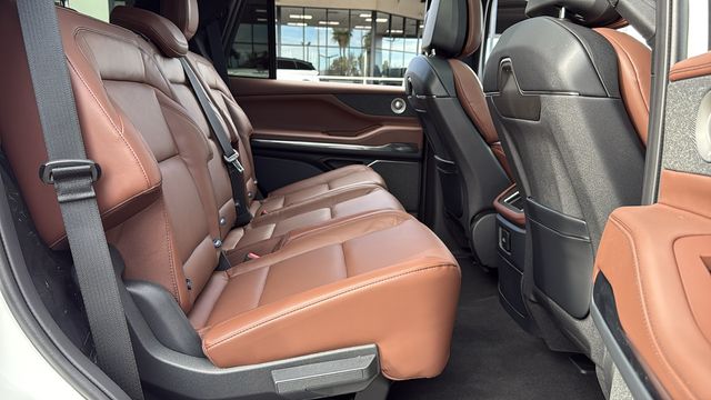 This Lincoln Navigator is equipped with Equipment Group 202A Reserve II, Heavy-Duty Trailer Tow Package (26mm Engine Radiator and Trailer Brake Controller), 4WD, Hot Chocolate Auto Htd &V Leather, 28 Speakers, 2nd Row Heated 40/20/40 Split Bench Seat, 3rd row seats: split-bench, 4-Wheel Disc Brakes, ABS brakes, Adaptive suspension, Adjustable pedals, Air Conditioning, All-Weather Flr Liners w/Fr & Rr Carpet Floor Mats, Alloy wheels, AM/FM radio: SiriusXM with 360L, Apple CarPlay/Android Auto, Audio memory, Auto High-beam Headlights, Auto Htd & Ventilated Premium Lthr Captain's Chair, Auto Start-Stop Technology, Auto tilt-away steering wheel, Auto-dimming door mirrors, Auto-dimming Rear-View mirror, Auto-leveling suspension, Automatic temperature control, Brake assist, Bumpers: body-color, Compass, Delay-off headlights, Driver door bin, Driver vanity mirror, Driver's Seat Mounted Armrest, Dual front impact airbags, Dual front side impact airbags, Electronic Stability Control, Emergency communication system: 911 Assist, Exterior Parking Camera Rear, Four wheel independent suspension, Front anti-roll bar, Front Bucket Seats, Front dual zone A/C, Front reading lights, Fully automatic headlights, Garage door transmitter, Heated door mirrors, Heated front seats, Heated rear seats, Heated steering wheel, HVAC memory, Illuminated entry, Leather steering wheel, Lincoln Connect, Lincoln Premium Connectivity, Low tire pressure warning, Memory seat, Navigation system: Connected Navigation (1-year trial), Occupant sensing airbag, Outside temperature display, Overhead airbag, Overhead console, Panic alarm, Passenger door bin, Passenger seat mounted armrest, Passenger vanity mirror, Pedal memory, Power adjustable rear head restraints, Power door mirrors, Power driver seat, Power moonroof: Panoramic Vista Roof, Power passenger seat, Power steering, Power windows, Radio data system, Radio: Revel Ultima 3D AM/FM/HD Audio System, Rain sensing wipers, Rear air conditioning, Rear anti-roll bar, Rear audio controls, Rear reading lights, Rear window defroster, Rear window wiper, Reclining 3rd row seat, Remote keyless entry, Security system, SiriusXM w/360L, Speed control, Speed-sensing steering, Speed-Sensitive Wipers, Split folding rear seat, Spoiler, Steering wheel memory, Steering wheel mounted audio controls, Tachometer, Telescoping steering wheel, Tilt steering wheel, Traction control, Trip computer, Turn signal indicator mirrors, Variably intermittent wipers, Ventilated front seats, and Wheels: 22" Dark Tarnished Aluminum. Price includes: $2000 - Wishlist Bonus Cash. Exp. 01/02/2026