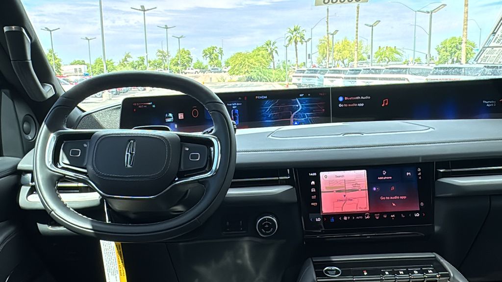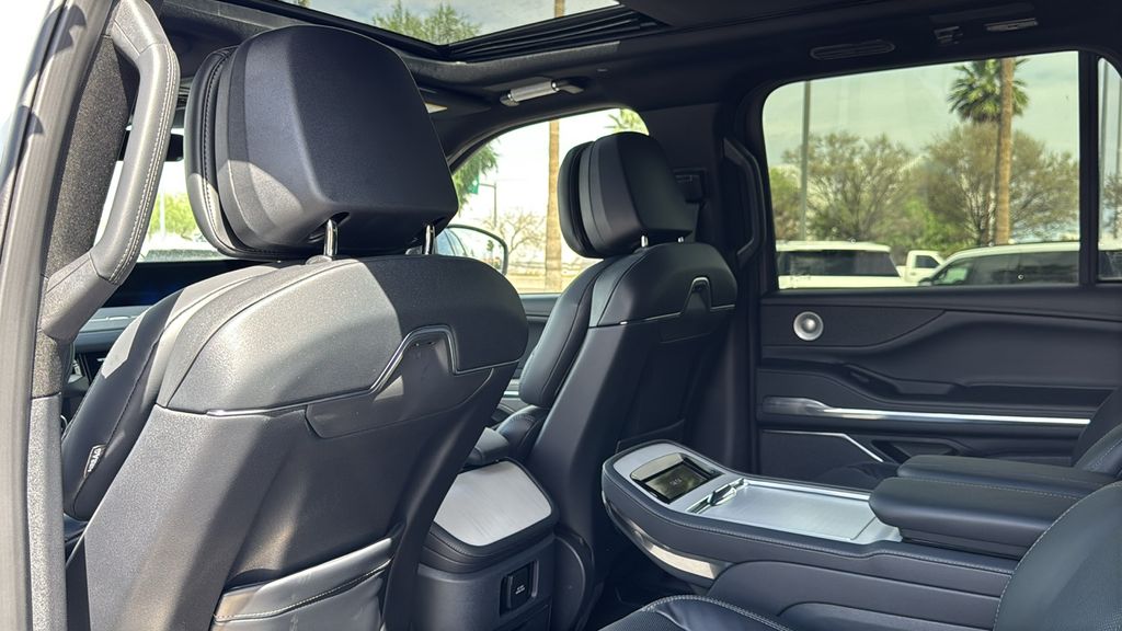 This Lincoln Navigator L is equipped with Equipment Group 202A Reserve II (Auto Heated/Ventilated Premium Leather Captain's Chairs, BlueCruise Equipped (4-Years Included), Lincoln App, Lincoln Digital Experience, Radio: Revel Ultima 3D Audio System, SiriusXM with 360L (3 Months Trial), and Wheels: 22" Dark Tarnished Aluminum), Heavy-Duty Trailer Tow Package (26mm Engine Radiator and Trailer Brake Controller), Jet Appearance Package (Black Accent Badge, Black Accent Interior Pack, Black Beltline Molding, Black Painted Roof Rails, Front Bumper Fascia, Lincoln Lit Star, Unique Lincoln Grille Pillar Black Surround, and Wheels: 22" High-Gloss Ebony Aluminum), Lincoln Connectivity Package (4-Years Included), Lincoln Security Package, 28 Speakers, 2nd Row Heated & Ventilated Dual Captain's Chair, 3rd row seats: split-bench, 4-Wheel Disc Brakes, ABS brakes, Adaptive suspension, Air Conditioning, Alloy wheels, AM/FM radio: SiriusXM with 360L, Apple CarPlay/Android Auto, Audio memory, Auto High-beam Headlights, Auto Start-Stop Technology, Auto tilt-away steering wheel, Auto-dimming door mirrors, Auto-dimming Rear-View mirror, Auto-leveling suspension, Automatic temperature control, Brake assist, Bumpers: body-color, Compass, Delay-off headlights, Driver door bin, Driver vanity mirror, Driver's Seat Mounted Armrest, Dual front impact airbags, Dual front side impact airbags, Electronic Stability Control, Emergency communication system: 911 Assist, Exterior Parking Camera Rear, Four wheel independent suspension, Front anti-roll bar, Front Bucket Seats, Front dual zone A/C, Front reading lights, Fully automatic headlights, Garage door transmitter, Heated door mirrors, Heated front seats, Heated rear seats, Heated steering wheel, HVAC memory, Illuminated entry, Leather steering wheel, Low tire pressure warning, Memory seat, Navigation system: Connected Navigation (1-year trial), Occupant sensing airbag, Outside temperature display, Overhead airbag, Overhead console, Panic alarm, Passenger door bin, Passenger seat mounted armrest, Passenger vanity mirror, Power adjustable rear head restraints, Power door mirrors, Power driver seat, Power moonroof: Panoramic Vista Roof, Power passenger seat, Power steering, Power windows, Radio data system, Rain sensing wipers, Rear air conditioning, Rear anti-roll bar, Rear audio controls, Rear reading lights, Rear window defroster, Rear window wiper, Reclining 3rd row seat, Remote keyless entry, Security system, Speed control, Speed-sensing steering, Speed-Sensitive Wipers, Split folding rear seat, Spoiler, Steering wheel memory, Steering wheel mounted audio controls, Tachometer, Telescoping steering wheel, Tilt steering wheel, Traction control, Trip computer, Turn signal indicator mirrors, Variably intermittent wipers, and Ventilated front seats.