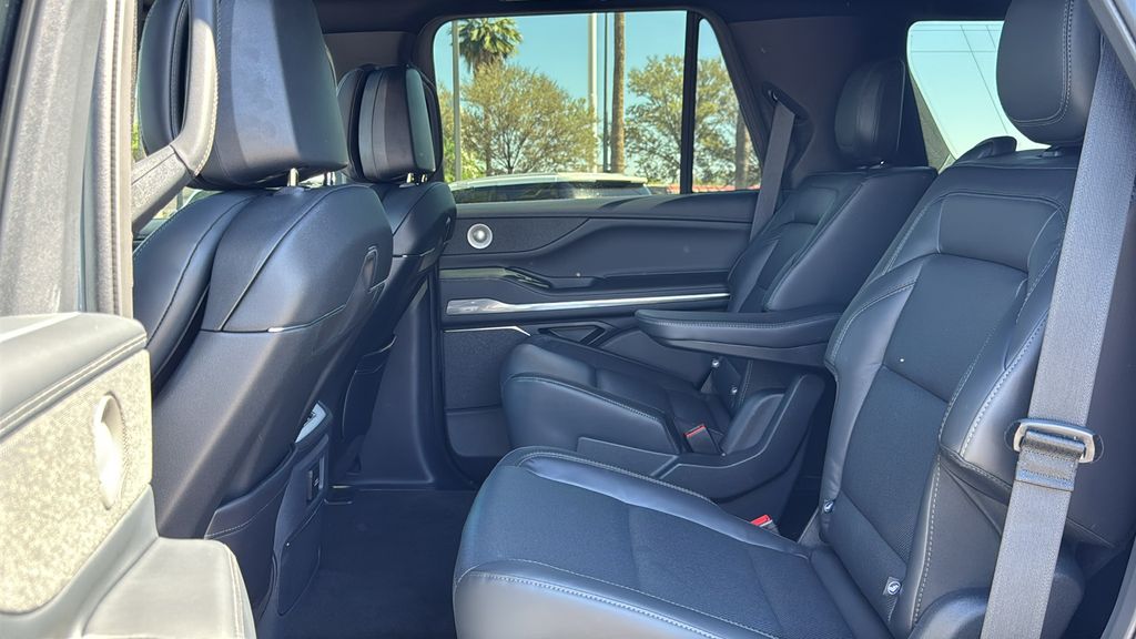 This Lincoln Navigator is equipped with Equipment Group 202A Reserve II (Auto Heated/Ventilated Premium Leather Captain's Chairs, BlueCruise Equipped (4-Years Included), Lincoln App, Lincoln Digital Experience, Radio: Revel Ultima 3D Audio System, SiriusXM with 360L (3 Months Trial), and Wheels: 22" Dark Tarnished Aluminum), Heavy-Duty Trailer Tow Package (26mm Engine Radiator and Trailer Brake Controller), Jet Appearance Package (Black Accent Badge, Black Accent Interior Pack, Black Beltline Molding, Black Painted Roof Rails, Front Bumper Fascia, Lincoln Lit Star, Unique Lincoln Grille Pillar Black Surround, and Wheels: 22" High-Gloss Ebony Aluminum), Lincoln Connectivity Package (4-Years Included), Lincoln Security Package, 4WD, Black Onyx Prem Lthr Leather, 28 Speakers, 3rd row seats: split-bench, 4-Wheel Disc Brakes, ABS brakes, Adaptive suspension, Air Conditioning, Alloy wheels, AM/FM radio: SiriusXM with 360L, Apple CarPlay/Android Auto, Audio memory, Auto High-beam Headlights, Auto Start-Stop Technology, Auto tilt-away steering wheel, Auto-dimming door mirrors, Auto-dimming Rear-View mirror, Auto-leveling suspension, Automatic temperature control, Brake assist, Bumpers: body-color, Compass, Delay-off headlights, Driver door bin, Driver vanity mirror, Driver's Seat Mounted Armrest, Dual front impact airbags, Dual front side impact airbags, Electronic Stability Control, Emergency communication system: 911 Assist, Exterior Parking Camera Rear, Four wheel independent suspension, Front anti-roll bar, Front Bucket Seats, Front dual zone A/C, Front reading lights, Fully automatic headlights, Garage door transmitter, Heated door mirrors, Heated front seats, Heated rear seats, Heated steering wheel, HVAC memory, Illuminated entry, Leather steering wheel, Low tire pressure warning, Memory seat, Navigation system: Connected Navigation (1-year trial), Occupant sensing airbag, Outside temperature display, Overhead airbag, Overhead console, Panic alarm, Passenger door bin, Passenger seat mounted armrest, Passenger vanity mirror, Power adjustable rear head restraints, Power door mirrors, Power driver seat, Power moonroof: Panoramic Vista Roof, Power passenger seat, Power steering, Power windows, Radio data system, Rain sensing wipers, Rear air conditioning, Rear anti-roll bar, Rear audio controls, Rear reading lights, Rear window defroster, Rear window wiper, Reclining 3rd row seat, Remote keyless entry, Security system, SiriusXM with 360L (4-Years Plan), Speed control, Speed-sensing steering, Speed-Sensitive Wipers, Split folding rear seat, Spoiler, Steering wheel memory, Steering wheel mounted audio controls, Tachometer, Telescoping steering wheel, Tilt steering wheel, Traction control, Trip computer, Turn signal indicator mirrors, Variably intermittent wipers, and Ventilated front seats.