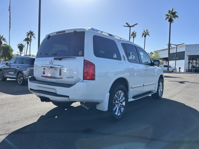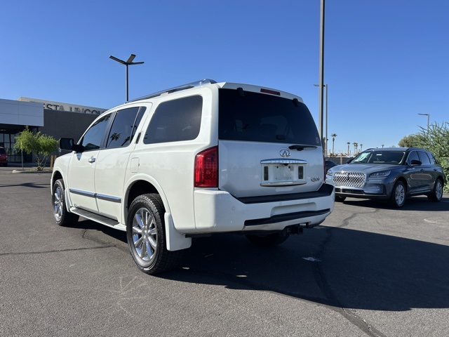 This INFINITI QX56 is equipped with Wheat Leather, 12 Speakers, 20" 9-Spoke Chrome Finished Alloy Wheels, 3.357 Axle Ratio, 3rd row seats: split-bench, 4-Wheel Disc Brakes, ABS brakes, Adjustable pedals, Air Conditioning, Alloy wheels, AM/FM radio: XM, Anti-whiplash front head restraints, Auto tilt-away steering wheel, Auto-dimming door mirrors, Auto-dimming Rear-View mirror, Auto-leveling suspension, Automatic temperature control, Bodyside moldings, Bose Premium Audio System w/XM Satellite, Brake assist, Bumpers: body-color, CD player, Chrome wheels, Delay-off headlights, Driver door bin, Driver vanity mirror, Driver's Seat Mounted Armrest, Dual front impact airbags, Dual front side impact airbags, Electronic Stability Control, Exterior Parking Camera Rear, Four wheel independent suspension, Front anti-roll bar, Front Bucket Seats, Front Center Armrest, Front dual zone A/C, Front fog lights, Front reading lights, Fully automatic headlights, Garage door transmitter: HomeLink(R), Genuine wood console insert, Genuine wood dashboard insert, Genuine wood door panel insert, Heated door mirrors, Heated Front Bucket Seats, Heated front seats, Heated rear seats, Heated steering wheel, High intensity discharge headlights: Xenon, Illuminated entry, Leather Shift Knob, Leather steering wheel, Leather-Appointed Seating Surfaces, Low tire pressure warning, Memory seat, Navigation System, Occupant sensing airbag, Outside temperature display, Overhead airbag, Overhead console, Panic alarm, Passenger door bin, Passenger seat mounted armrest, Passenger vanity mirror, Pedal memory, Power door mirrors, Power driver seat, Power Liftgate, Power moonroof, Power passenger seat, Power steering, Power windows, Radio data system, Rear air conditioning, Rear anti-roll bar, Rear audio controls, Rear Parking Sensors, Rear reading lights, Rear seat center armrest, Rear window defroster, Rear window wiper, Reclining 3rd row seat, Remote keyless entry, Roof rack, Security system, Speed control, Speed-sensing steering, Speed-Sensitive Wipers, Split folding rear seat, Steering wheel memory, Steering wheel mounted audio controls, Tachometer, Tilt steering wheel, Traction control, Trip computer, Turn signal indicator mirrors, Variably intermittent wipers, and Voltmeter. Recent Arrival!