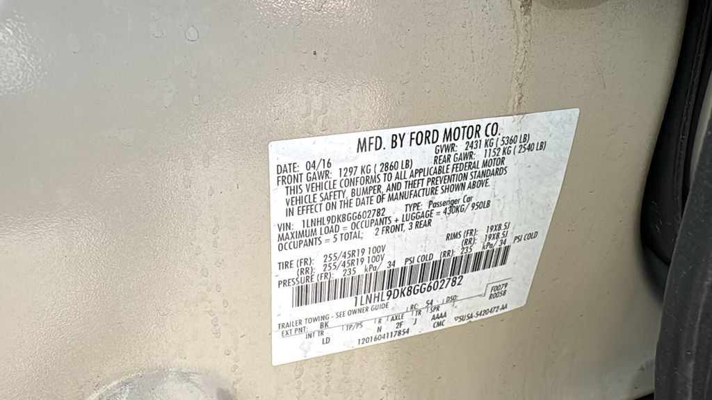 This Lincoln MKS is equipped with Elite Package (1st Row Multi-Contour Seats, BLIS Blind Spot Information System, Power Adjustable Pedals w/Memory, Power Rear Sunshade, Radio: AM/FM/CD/MP3/HD Audio System, SYNC 3, and THX II Audio System), Equipment Group 101A, Premium Wood Package, 10 Speakers, 19" Premium Painted Aluminum Wheels, 4-Wheel Disc Brakes, ABS brakes, Adaptive suspension, Air Conditioning, Alloy wheels, AM/FM radio: SiriusXM, Auto High-beam Headlights, Auto tilt-away steering wheel, Auto-dimming door mirrors, Auto-dimming Rear-View mirror, Automatic temperature control, Brake assist, Bumpers: body-color, CD player, Compass, Delay-off headlights, Driver door bin, Driver vanity mirror, Dual front impact airbags, Dual front side impact airbags, Electronic Stability Control, Emergency communication system: SYNC 3 911 Assist, Exterior Parking Camera Rear, Four wheel independent suspension, Front anti-roll bar, Front Bucket Seats, Front dual zone A/C, Front fog lights, Front License Plate Bracket, Front reading lights, Fully automatic headlights, Garage door transmitter: HomeLink, Heated door mirrors, Heated front seats, High-Intensity Discharge Headlights, Illuminated entry, Leather steering wheel, Low tire pressure warning, Memory seat, Navigation System, Occupant sensing airbag, Outside temperature display, Overhead airbag, Overhead console, Panic alarm, Passenger door bin, Passenger vanity mirror, Power door mirrors, Power driver seat, Power passenger seat, Power steering, Power windows, Premium Perforated Leather-Trimmed Bucket Seats, Radio data system, Radio: AM/FM/CD/MP3-Capable Lincoln Premium Audio, Rain sensing wipers, Rear anti-roll bar, Rear reading lights, Rear seat center armrest, Rear window defroster, Remote keyless entry, Security system, Speed control, Speed-sensing steering, Steering wheel memory, Steering wheel mounted audio controls, Tachometer, Telescoping steering wheel, Tilt steering wheel, Traction control, Trip computer, Variably intermittent wipers, and Ventilated front seats. Recent Arrival!