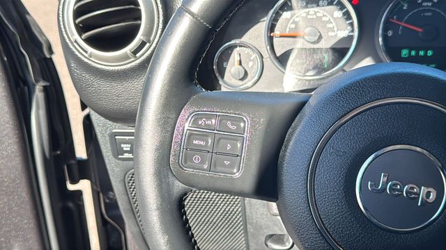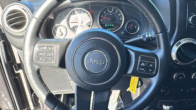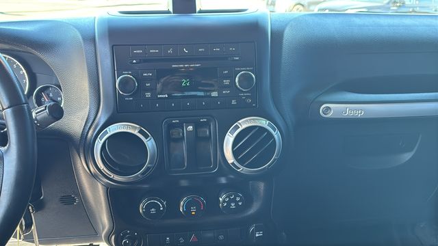 This Jeep Wrangler JK is equipped with Connectivity Group (Tire Pressure Monitoring Display, Uconnect Voice Command w/Bluetooth, and Vehicle Information Center), Power Convenience Group (Auto-Dimming Mirror w/Reading Lamp, Front 1-Touch Down Power Windows, Power Heated Mirrors, Power Locks, Remote Keyless Entry, and Security Alarm), Quick Order Package 24R, 17" x 7.5" Polished Mineral Gray Wheels, 4-Wheel Disc Brakes, 4.10 Rear Axle Ratio, 8 Speakers, ABS brakes, Add 4.10 Axle Ratio, Air Conditioning, Alloy wheels, Alpine 9-Speaker w/All Weather Subwoofer, AM/FM radio: SiriusXM, Audio Jack Input for Mobile Devices, Black 3-Piece Hard Top, Brake assist, CD player, Cloth Seats w/Adjustable Head Restraints, Compass, Delete Sunrider Soft Top, Driver door bin, Driver Height Adjuster Seat, Driver vanity mirror, Dual front impact airbags, Electronic Stability Control, Freedom Panel Storage Bag, Front anti-roll bar, Front Bucket Seats, Front Center Armrest w/Storage, Front fog lights, Front Seat Back Map Pockets, Fully automatic headlights, Integrated roll-over protection, Leather steering wheel, Low tire pressure warning, Manual Door Locks, Manual Windows, Manufacturer's Statement of Origin, MOPAR Slush Mats, Occupant sensing airbag, Outside temperature display, Passenger door bin, Passenger vanity mirror, Performance Suspension, Power steering, Radio data system, Radio: 130, Rear anti-roll bar, Rear View Day/Night Mirror, Rear Window Defroster, Rear Window Wiper/Washer, Speed control, Steering wheel mounted audio controls, Sunrider Soft Top, Tachometer, Tilt steering wheel, Traction control, Trip computer, and Variably intermittent wipers.