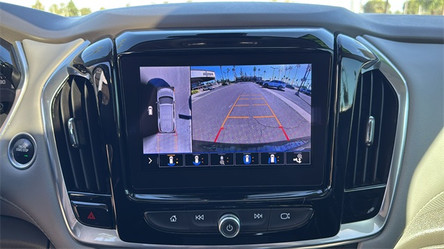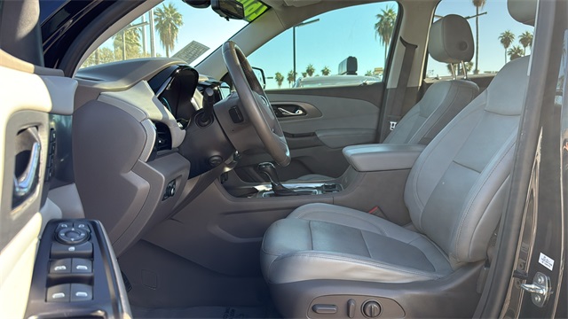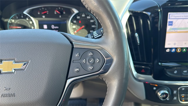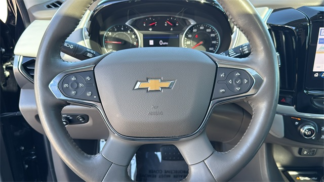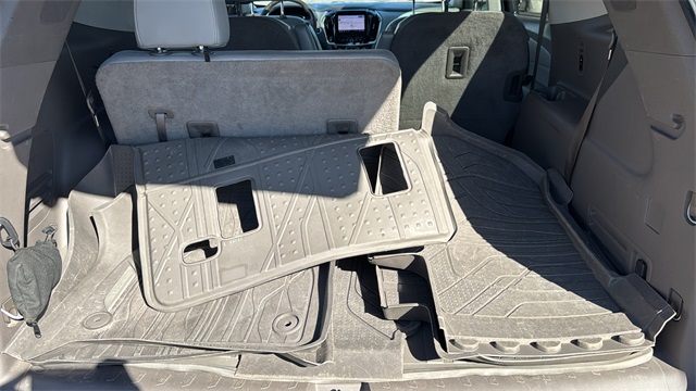 This Chevrolet Traverse is equipped with Cargo Package (LPO) (Retractable Cargo Shade and Vertical Cargo Net (LPO)), Floor Liner Package (LPO) (1st & 2nd Row All-Weather Floor Liner (LPO), 3rd Row All-Weather Floor Liner (LPO), and Integrated Cargo Liner (LPO)), Preferred Equipment Group 1LZ, Trailering Equipment (Heavy-Duty Cooling System, Hitch Guidance w/Hitch View, and Trailering Assist Guidelines), 10 Speakers, 3.49 Axle Ratio, 3rd row seats: split-bench, 4-Wheel Disc Brakes, 7-Passenger Seating (2-2-3 Seating Configuration), ABS brakes, Air Conditioning, Alloy wheels, AM/FM radio: SiriusXM, Apple CarPlay/Android Auto, Auto High-beam Headlights, Auto-dimming door mirrors, Auto-dimming Rear-View mirror, Automatic temperature control, Bose Premium 10-Speaker Audio System Feature, Brake assist, Bumpers: body-color, Compass, Delay-off headlights, Driver door bin, Driver vanity mirror, Dual front impact airbags, Dual front side impact airbags, Electronic Stability Control, Emergency communication system: OnStar and Chevrolet connected services capable, Four wheel independent suspension, Front & Rear Black Bowtie Emblems (LPO), Front anti-roll bar, Front Bucket Seats, Front Center Armrest, Front dual zone A/C, Front fog lights, Front reading lights, Fully automatic headlights, Garage door transmitter, Heated door mirrors, Heated front seats, Heated rear seats, Heated steering wheel, Illuminated entry, Leather steering wheel, Low tire pressure warning, Memory seat, Navigation System, Occupant sensing airbag, Outside temperature display, Overhead airbag, Overhead console, Panic alarm, Passenger door bin, Passenger vanity mirror, Perforated Leather-Appointed Seat Trim, Power door mirrors, Power driver seat, Power Liftgate, Power passenger seat, Power steering, Power windows, Premium audio system: Chevrolet MyLink, Radio data system, Radio: Chevrolet Infotainment 3 Premium System, Rear air conditioning, Rear anti-roll bar, Rear reading lights, Rear window defroster, Rear window wiper, Remote keyless entry, Roof rack: rails only, Security system, SiriusXM w/360L, Speed control, Speed-sensing steering, Spoiler, Steering wheel memory, Steering wheel mounted audio controls, Tachometer, Telescoping steering wheel, Tilt steering wheel, Traction control, Trip computer, Turn signal indicator mirrors, Variably intermittent wipers, Ventilated front seats, Voltmeter, and Wheels: 20" Argent Metallic Machine Faced Aluminum.