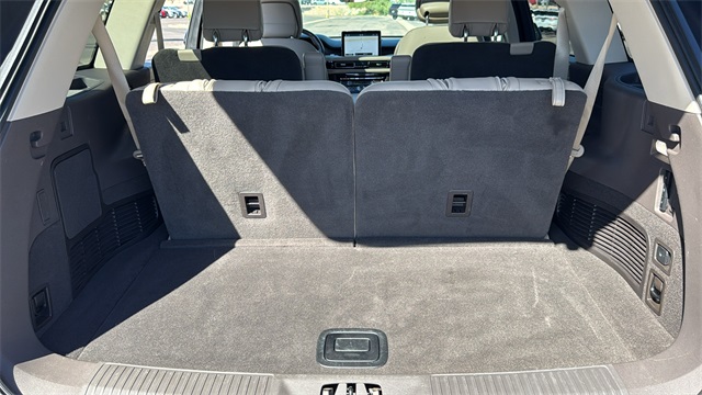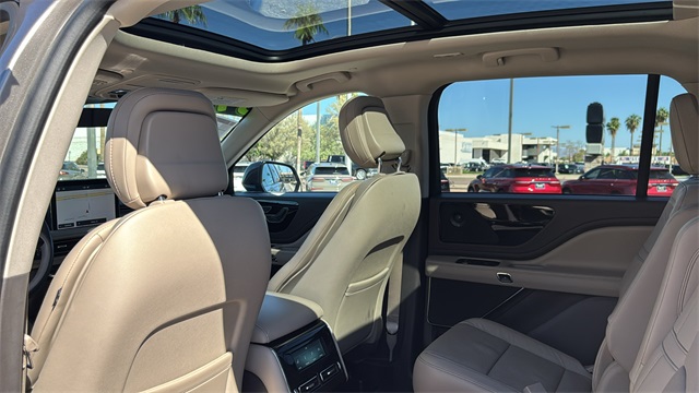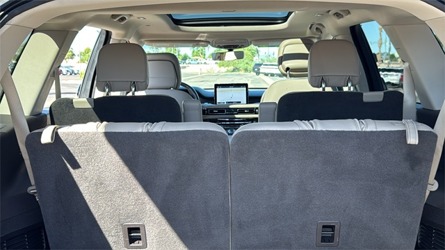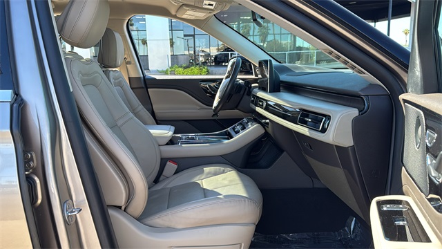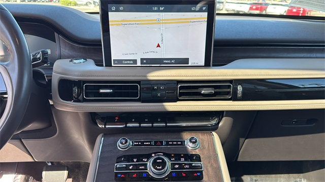 This Lincoln Aviator is equipped with Elements Package Plus (Heated Steering Wheel, Heated VisioBlade Wipers, Heated/Ventilated 2nd Row Outboard Seats, and Heated/Ventilated Driver & Passenger Seats), Equipment Group 300A, Lincoln Co-Pilot360 Plus (Active Park Assist Plus, Adaptive Cruise Control w/Traffic Jam Assist, Evasive Steering Assist, and Reverse Brake Assist), 3.0L V6 Hybrid Turbocharged DOHC 24V LEV3-SULEV30, 14 Speakers, 20" Ultra Bright Machined Aluminum Wheels, 3.31 Axle Ratio, 3rd row seats: split-bench, 4-Wheel Disc Brakes, ABS brakes, Adaptive suspension, Air Conditioning, Alloy wheels, AM/FM radio: SiriusXM, Audio memory, Auto High-beam Headlights, Auto-dimming door mirrors, Auto-dimming Rear-View mirror, Automatic temperature control, Brake assist, Bumpers: body-color, Compass, Delay-off headlights, Driver door bin, Driver vanity mirror, Dual front impact airbags, Dual front side impact airbags, Electronic Stability Control, Emergency communication system: SYNC 3 911 Assist, Four wheel independent suspension, Front anti-roll bar, Front Bucket Seats, Front Center Armrest, Front dual zone A/C, Front fog lights, Front reading lights, Fully automatic headlights, Garage door transmitter, Heated door mirrors, Heated front seats, HVAC memory, Illuminated entry, Knee airbag, Low tire pressure warning, Memory seat, Navigation System, Occupant sensing airbag, Outside temperature display, Overhead airbag, Overhead console, Panic alarm, Passenger door bin, Passenger vanity mirror, Power door mirrors, Power driver seat, Power Liftgate, Power moonroof, Power passenger seat, Power steering, Power windows, Premium Leather Enhanced Micro-Perforated Seats, Radio data system, Radio: Revel AM/FM Audio System w/14 Speakers, Rain sensing wipers, Rear air conditioning, Rear anti-roll bar, Rear audio controls, Rear dual zone A/C, Rear reading lights, Rear window defroster, Rear window wiper, Remote keyless entry, Security system, SiriusXM Radio, Speed control, Speed-Sensitive Wipers, Split folding rear seat, Spoiler, Steering wheel memory, Steering wheel mounted A/C controls, Steering wheel mounted audio controls, SYNC 3 Communication & Entertainment System, Tachometer, Telescoping steering wheel, Tilt steering wheel, Traction control, Trip computer, Turn signal indicator mirrors, Variably intermittent wipers, and Ventilated front seats.