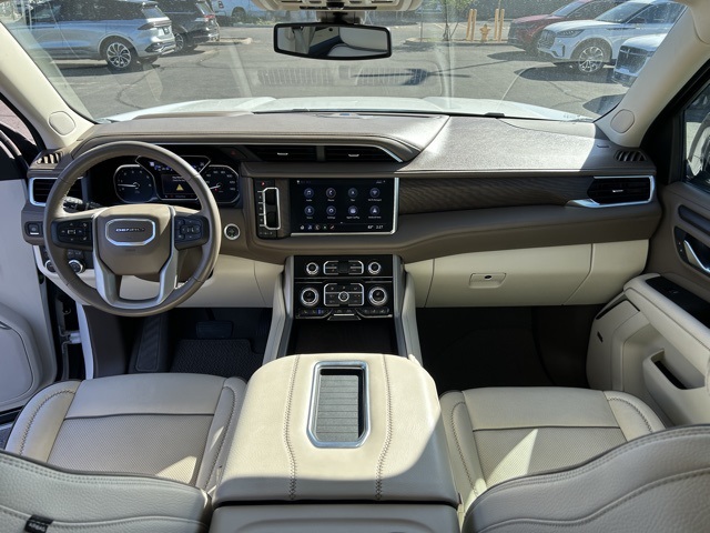 This GMC Yukon is equipped with Preferred Equipment Group 5SA (12-Way Power Seat Adjusters, 15" Diagonal Multi-Color Head-Up Display, 2 Presets For Outside Rearview Mirrors, 3rd Row 60/40 Power-Folding Split-Bench Seat, Bright Front & Rear Door Sill Plates, Chrome Door Handles w/Body-Color Strip, Dual Exhaust System, Galvano Bodyside Moldings, Hands-Free Power Programmable Rear Liftgate, HD Surround Vision, Heated & Ventilated Driver & Front Passenger Seats, Heated 2nd Row Outboard Position Seats, Heated Automatic Steering Wheel, Heated Driver & Front Passenger Seats, Hill Descent Control, Inside Rear-View Auto-Dimming Mirror, Outside Heated Power-Adjustable Mirrors, Power Release 2nd Row Bucket Seats, Power Tilt & Telescopic Steering Column, Rear Pedestrian Alert, Safety Alert Seat, and Universal Home Remote), 4WD, 14 Speakers, 3.23 Rear Axle Ratio, 3rd row seats: split-bench, 4-Wheel Disc Brakes, ABS brakes, Adaptive suspension, Air Conditioning, Alloy wheels, AM/FM radio: SiriusXM with 360L, Apple CarPlay/Android Auto, Auto High-beam Headlights, Auto-dimming door mirrors, Auto-dimming Rear-View mirror, Auto-leveling suspension, Automatic Emergency Braking, Automatic temperature control, Bodyside moldings, Bose 14-Speaker Surround w/CenterPoint, Brake assist, Bumpers: body-color, Compass, Delay-off headlights, Driver door bin, Driver vanity mirror, Dual front impact airbags, Dual front side impact airbags, Dual-Pane Panoramic Power Sunroof, Electronic Stability Control, Emergency communication system: OnStar and GMC connected services capable, Floor Console, Following Distance Indicator, Forward Collision Alert, Four wheel independent suspension, Front & Rear Park Assist, Front anti-roll bar, Front Bucket Seats, Front Center Armrest, Front dual zone A/C, Front fog lights, Front Pedestrian Braking, Front reading lights, Fully automatic headlights, Garage door transmitter, HD Radio, Heads-Up Display, Heated door mirrors, Heated front seats, Heated rear seats, Heated steering wheel, Illuminated entry, IntelliBeam Automatic High Beam On/Off, Lane Change Alert w/Side Blind Zone Alert, Lane Keep Assist w/Lane Departure Warning, Leather steering wheel, Low tire pressure warning, Magnetic Ride Control Suspension, Memory seat, Navigation System, Not Equipped w/Automatic Stop/Start, Occupant sensing airbag, Outside temperature display, Overhead airbag, Overhead console, Panic alarm, Passenger door bin, Passenger vanity mirror, Perforated Leather Seating Surfaces, Power door mirrors, Power driver seat, Power Liftgate, Power passenger seat, Power steering, Power windows, Power-Retractable Assist Steps, Radio: AM/FM/SiriusXM w/Navigation, Rain sensing wipers, Rear air conditioning, Rear anti-roll bar, Rear Cross Traffic Alert, Rear reading lights, Rear Seat Media System, Rear window defroster, Rear window wiper, Remote keyless entry, Roof rack: rails only, Security system, SiriusXM w/360L, Speed control, Speed-sensing steering, Split folding rear seat, Spoiler, Steering wheel memory, Steering wheel mounted audio controls, Tachometer, Telescoping steering wheel, Tilt steering wheel, Traction control, Trip computer, Turn signal indicator mirrors, Variably intermittent wipers, Ventilated front seats, Voltmeter, Wheel Locks, Wheels: 20" x 9" 6-Spoke Polished Aluminum, and Wheels: 22" x 9" Bright Machined Aluminum. Recent Arrival!