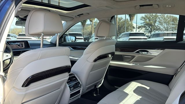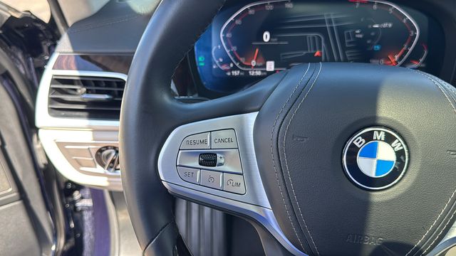 This BMW 7 Series is equipped with Connected Package Pro, Interior Design Package (Rear Seat Belt Cover in Wood Trim), Interior Design Package (7S5), Premium Package, Black Leather, 16 Speakers, 4-Wheel Disc Brakes, ABS brakes, Adaptive suspension, Air Conditioning, Alloy wheels, AM/FM radio: SiriusXM, Anti-whiplash front head restraints, Apple CarPlay & Android Auto Compatibility, Auto High-beam Headlights, Auto tilt-away steering wheel, Auto-dimming door mirrors, Auto-dimming Rear-View mirror, Auto-leveling suspension, Automatic temperature control, Badge Deletion, Brake assist, Bumpers: body-color, Chestnut Wood Trim w/Wooden Inlay, ConnectedDrive Services, Dakota Leather Upholstery, Delay-off headlights, Door auto-latch, Drive Recorder, Driver door bin, Driver vanity mirror, Dual front impact airbags, Dual front side impact airbags, Electronic Stability Control, Emergency communication system: BMW Assist eCall, Four wheel independent suspension, Front & Rear Heated Seats, Front anti-roll bar, Front Bucket Seats, Front Center Armrest, Front dual zone A/C, Front reading lights, Front Ventilated Seats, Fully automatic headlights, Garage door transmitter, Genuine wood console insert, Genuine wood dashboard insert, Genuine wood door panel insert, Gesture Control, harman/kardon Surround Sound System, harman/kardon Speakers, Head restraints memory, Heated door mirrors, Heated front seats, Heated Front Seats, Armrests & Steering Wheel, Heated steering wheel, Illuminated entry, Knee airbag, Leather Shift Knob, Leather steering wheel, Low tire pressure warning, Memory seat, Multi-Contour Seats, Navigation System, Occupant sensing airbag, Outside temperature display, Overhead airbag, Overhead console, Panic alarm, Passenger door bin, Passenger vanity mirror, Power adjustable front head restraints, Power door mirrors, Power driver seat, Power moonroof: Panorama, Power passenger seat, Power steering, Power windows, Radio data system, Radio: AM/FM/HD, Rain sensing wipers, Rear air conditioning, Rear anti-roll bar, Rear dual zone A/C, Rear reading lights, Rear seat center armrest, Rear Window Blind, Rear window defroster, Remote keyless entry, Security system, SiriusXM w/360L, Speed control, Speed-sensing steering, Speed-Sensitive Wipers, Sport steering wheel, Steering wheel memory, Steering wheel mounted audio controls, Tachometer, Telescoping steering wheel, Tilt steering wheel, Traction control, Trip computer, Variably intermittent wipers, Weather band radio, Wheels: 18" x 8.0" V-Spoke Style 642, Wheels: 20" x 8.5" Fr & 20" x 10" Rr V-Spoke (DISC), WiFi Hotspot, Wireless Charging, and Wood Inlay Leather Steering Wheel.